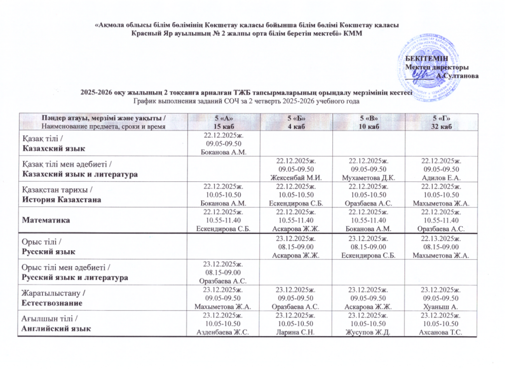 2025-2026 оқу жылының 2 тоқсанға арналған ТЖБ тапсырмаларының орындалу мерзімінің кестесі